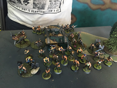 Los 20 guardias avanzan hacia el centro. Los guardias que huían se reagrupan. La de mando del pelotón dispara sólo 1 lanzallamas, y sin éxito, ya que la unidad que huyó le obstaculizaba para colocar las plantillas. Se da la orden de "Volved a la formación", y deciden asaltarme! La de mando con lanzallamas también asalta a los orkos. El mando de compañía asalta al kóptero.
